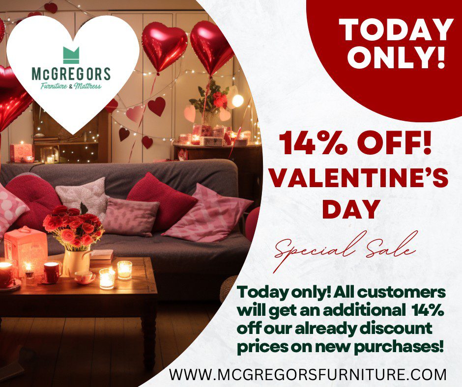 Valentine’s Day is coming up, which means crowded restaurants, long waits, and paying extra for food you could’ve made better at home. Or… you could skip all that. This Saturday only, McGregors Furniture & Mattress is offering 14% OFF EVERYTHING for the 14th. No reservations required. No dress code. Just better furniture and a lot more comfort. Celebrate Valentine’s Day the easy way. Stop in, save big, and enjoy furniture that won’t rush you out the door when the next table needs your seat.